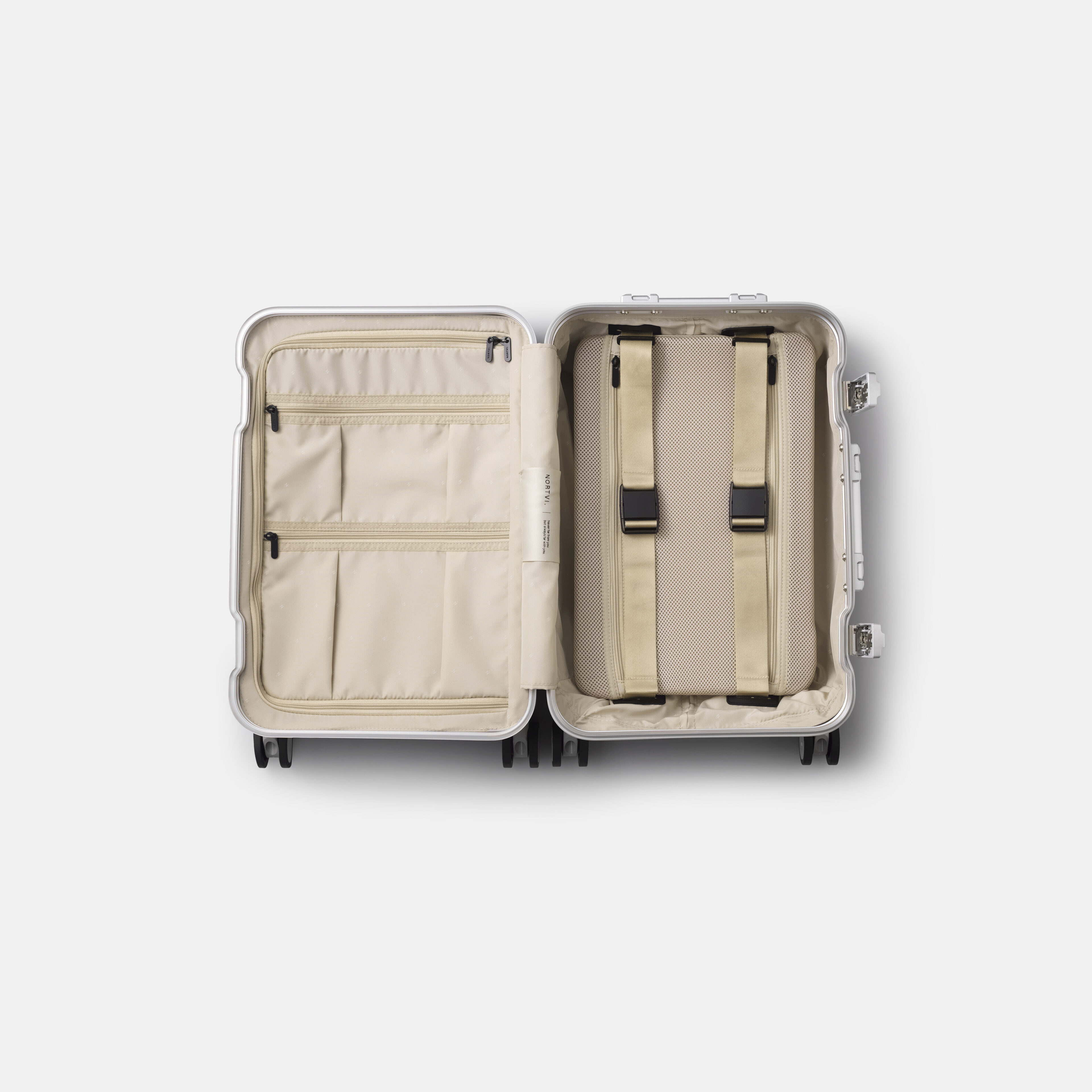 On the inside, the Aluminium is designed for efficient and effortless packing, with thoughtfully arranged compartments and an integrated compression pad. Together, these features make the Aluminium the ideal companion for travellers seeking the perfect balance between sophistication and practicality.